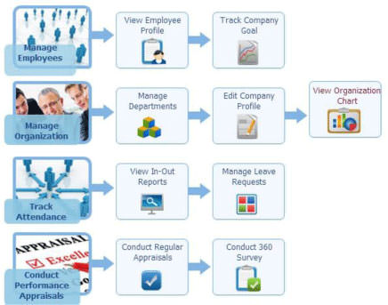 You are welcome to HRMS first page once again. Let’s start from the HRMS Diagram.You will discover how to manage your system properly with the instruction of the map. You can manage your employees, their positions directly from this page by clicking on the Manage Employees button. In order to View Organization Chart, you should have an access to the Manage Organization page. There you can allocate departments in the organization and manage salary grades by opening the Manage Departments page and edit Company Profile. Trackattendance viewing in-out reports and managingLeave Requests. Through Conduct Performance Appraisalssection, you are able to Conduct Regular Appraisals and 360° Survey.