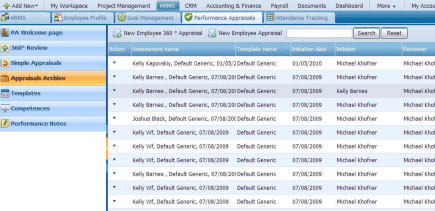 Appraisals Archivesection stores all appraisals. Information as the assessment name, template name, initiation date, initiator, and reviewer name can be reviewed.