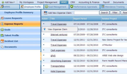 - Employee Profile, illustrates the features such as leave requests, expense reports, employee goals, talent profile and incident list.